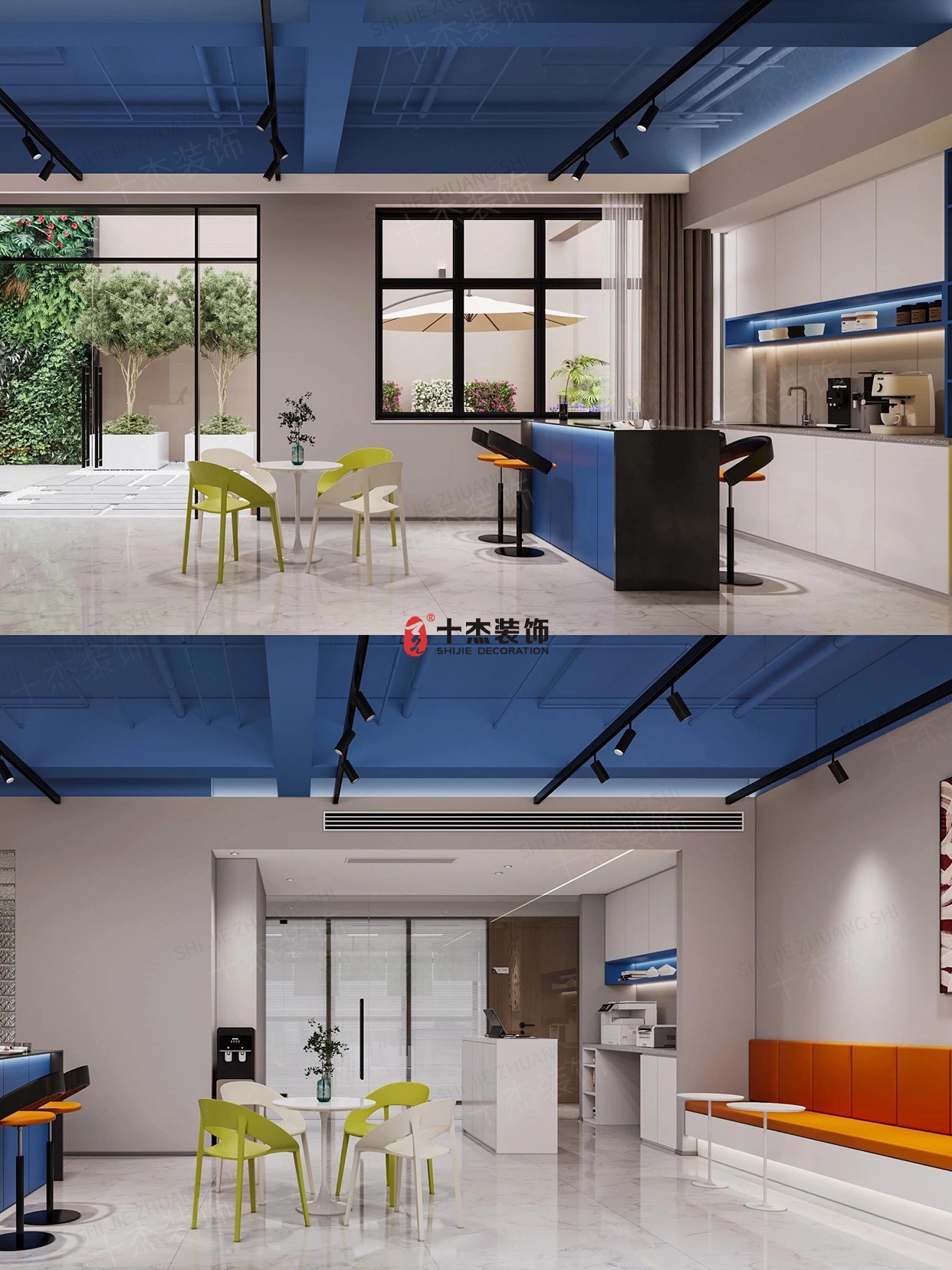 活力色彩組:橙色吧臺、綠色座椅……