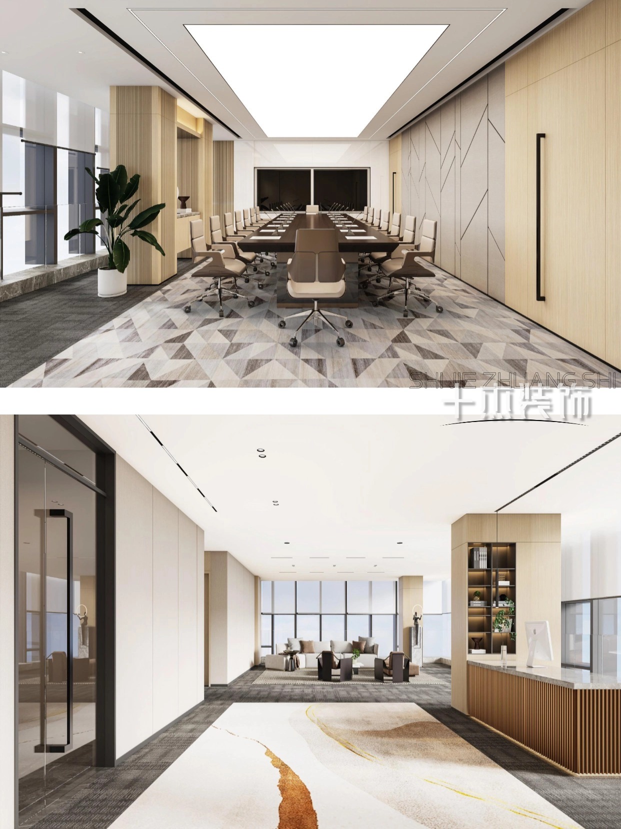 幾何圖案地毯延伸空間感,長形會(huì)議桌配舒適辦公椅