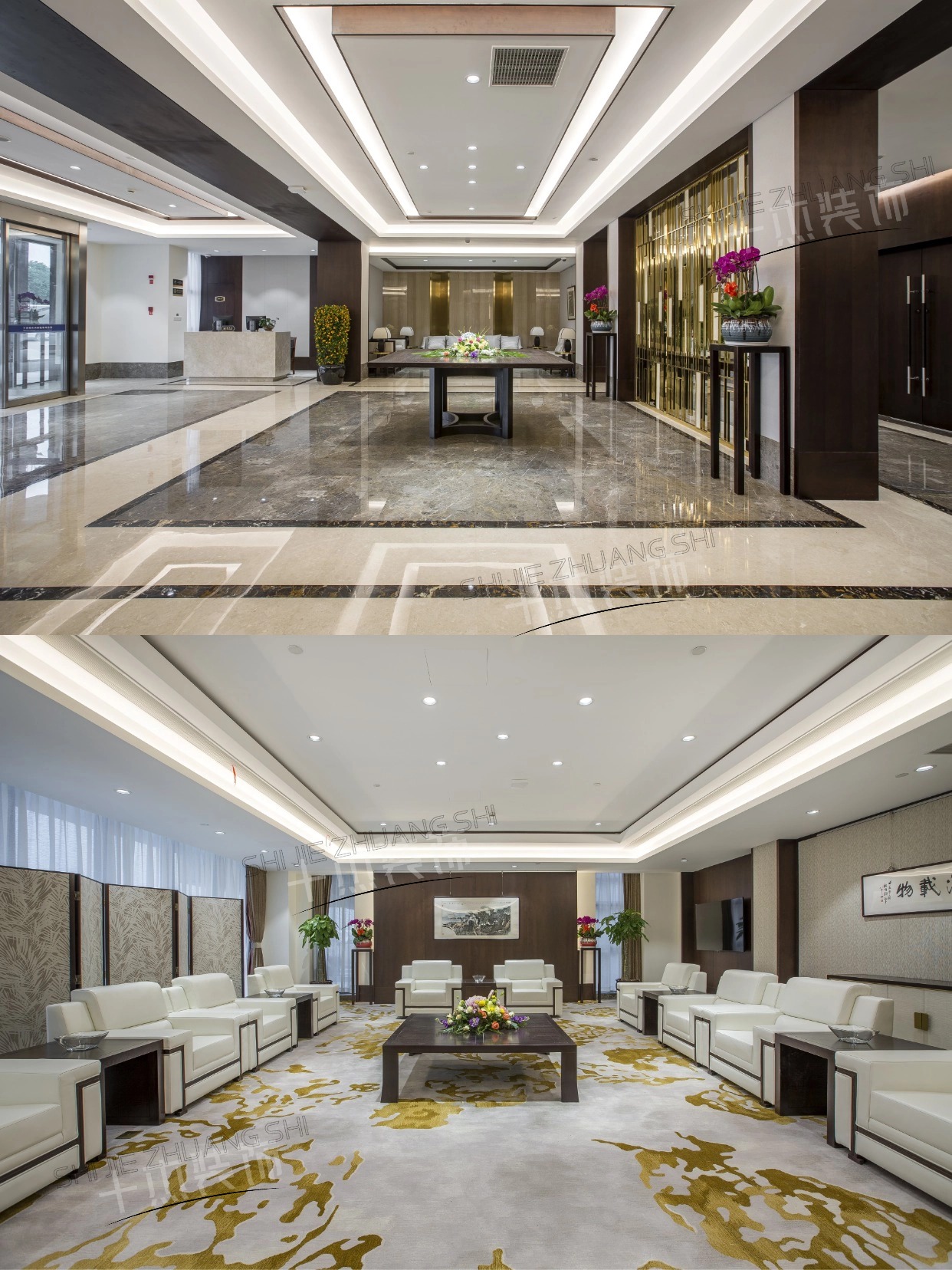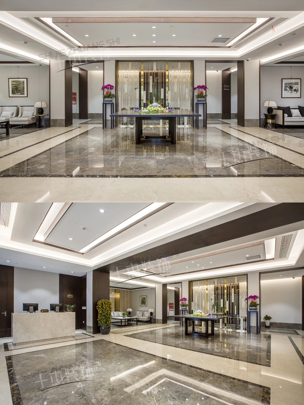 以現(xiàn)代輕奢融合東方雅致,大理石地面紋理精致